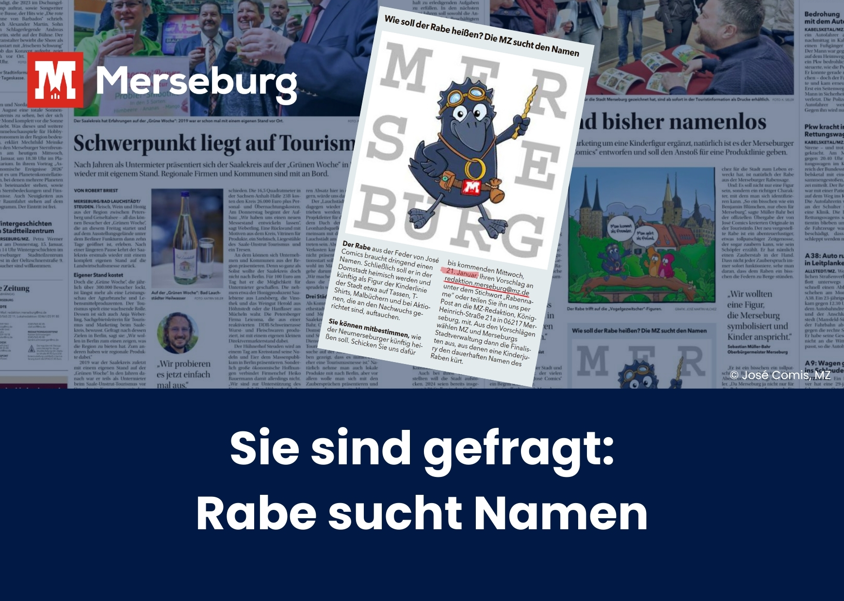 Unser Merseburger Rabe braucht Ihre Hilfe. Die neue Figur soll auf Tassen, in Malbüchern, einem Zauberkasten und vielem mehr unsere Stadt den Kindern näherbringen, doch so ganz ohne Namen bekommt sie keine Geburtsurkunde. Helfen Sie dem abenteuerlustigen und etwas tollpatschigen, kleinen Raben, indem Sie Ihre Namensvorschläge unter dem Betreff "Rabenname" noch bis zum 21. Januar 2026 an redaktion.merseburg@mz.de oder per Post an MZ-Redaktion, König-Heinrich-Str. 21a, 06217 Merseburg senden!