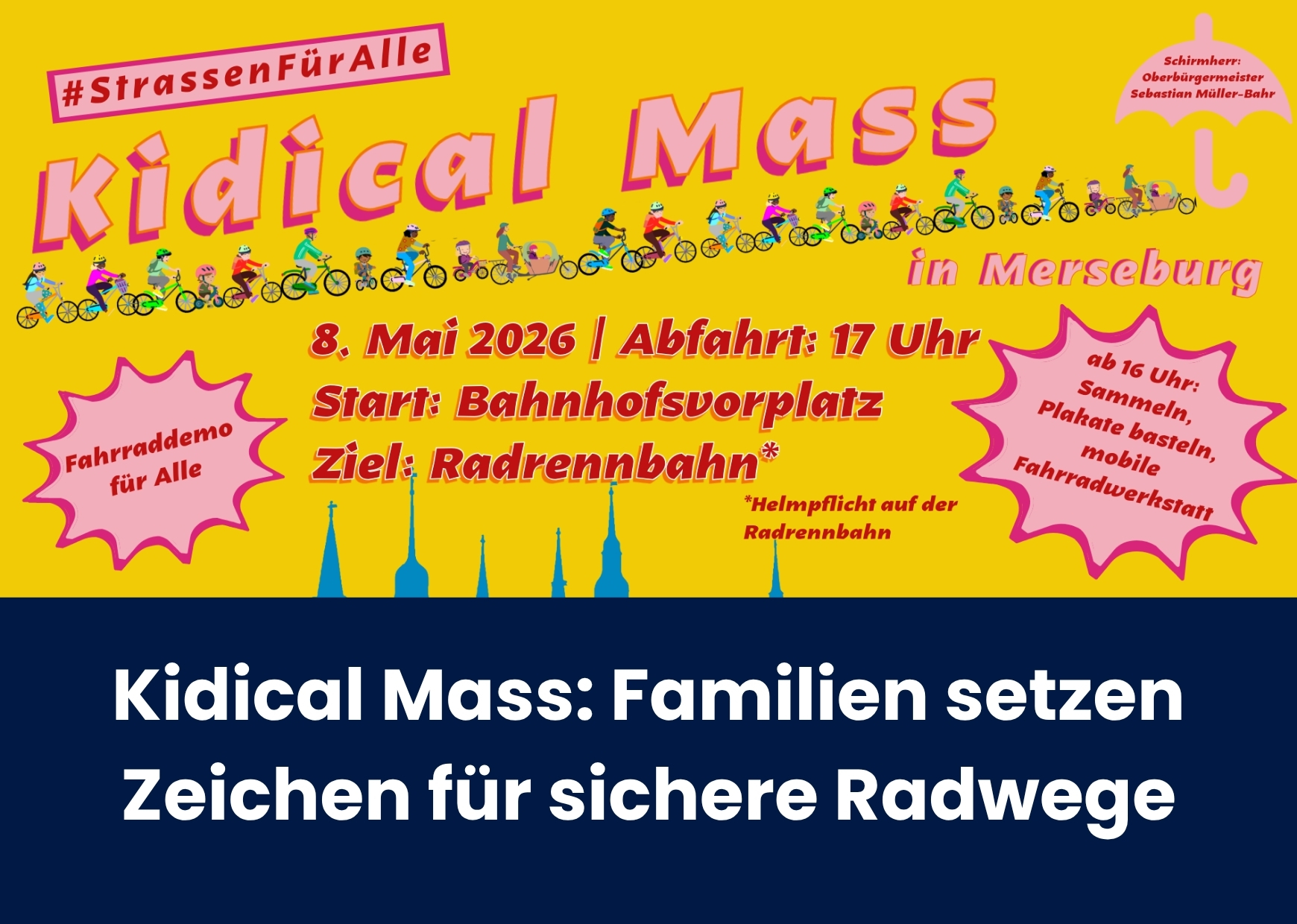 Am 8. Mai 2026 wird Merseburg zur Fahrradstadt: Im Rahmen einer Kidical Mass fahren Kinder, Eltern und Großeltern gemeinsam durch die Stadt und setzen ein Zeichen für mehr Sicherheit im Straßenverkehr.