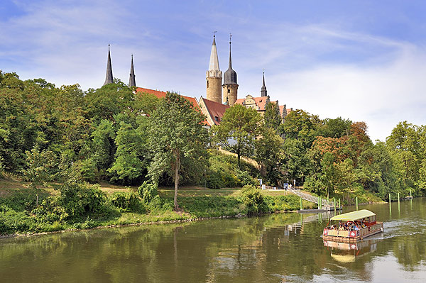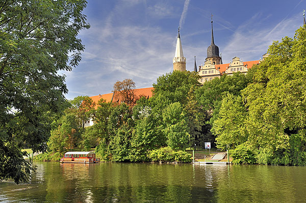 Um auch für Wassertouristen ein attraktives Angebot zu schaffen, wurden unterhalb des Dom-Schlossbereiches an der Saale zwei Schiffsanlegestellen für Wassersportler und Schiffsausflugsverkehr errichtet. Damit ist Merseburg in die touristische Landesinitiative Blaues Band eingebunden, das neben der Möglichkeit, die Schönheiten der von Kultur und Natur geprägten Landschaft zu Wasser zu erkunden, zum Besuch herausragender touristischer Ziele in Sachsen-Anhalt einlädt. Die Stadt kann von Wassersportlern erreicht und der Schiffsausflugsverkehr von Halle und aus der Unstrut-Region nach Merseburg erweitert werden. Veranstalter können Tagungsangebote durch Saale-Schifffahrten von und nach Merseburg ergänzen und attraktiver gestalten. Der flussbegleitende überregionale Saale-Radwanderweg erschließt dem Besucher per Rad oder zu Fuß die zahlreichen kulturhistorischen Sehenswürdigkeiten. Unweit des Schiffsanlegers befindet sich der Skulpturenpark, in dem die Skulpturen der am 9. Internationalen Bildhauersymposium teilgenommenen Künstler aufgestellt wurden.