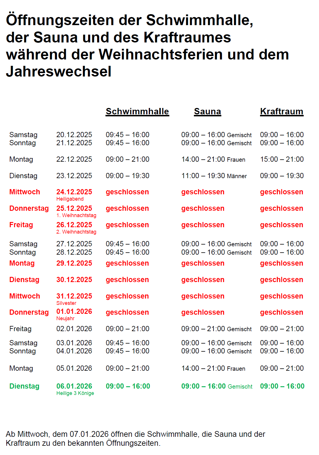 - Wettkampfbecken: 1,80m Wassertiefe, 5 x 25m Bahnen, ca. 28°C