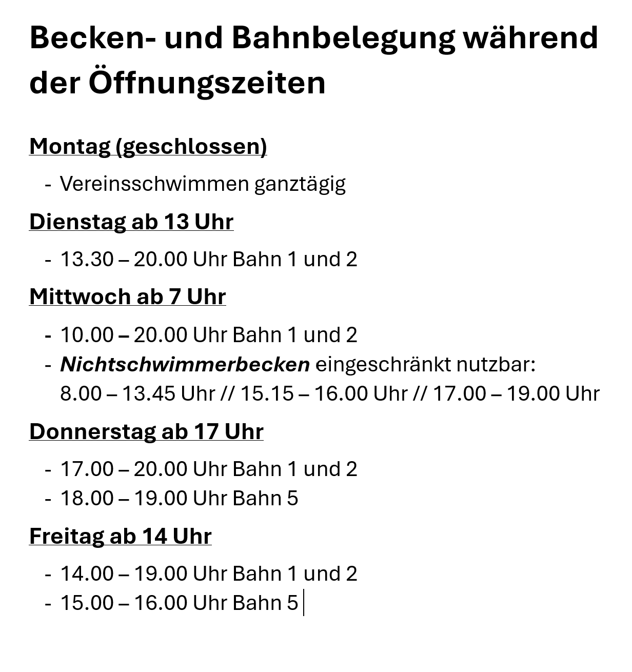 - Vereinsschwimmen (Rettungsschwimmen, Reha-Vereine, Schwimmvereine...)